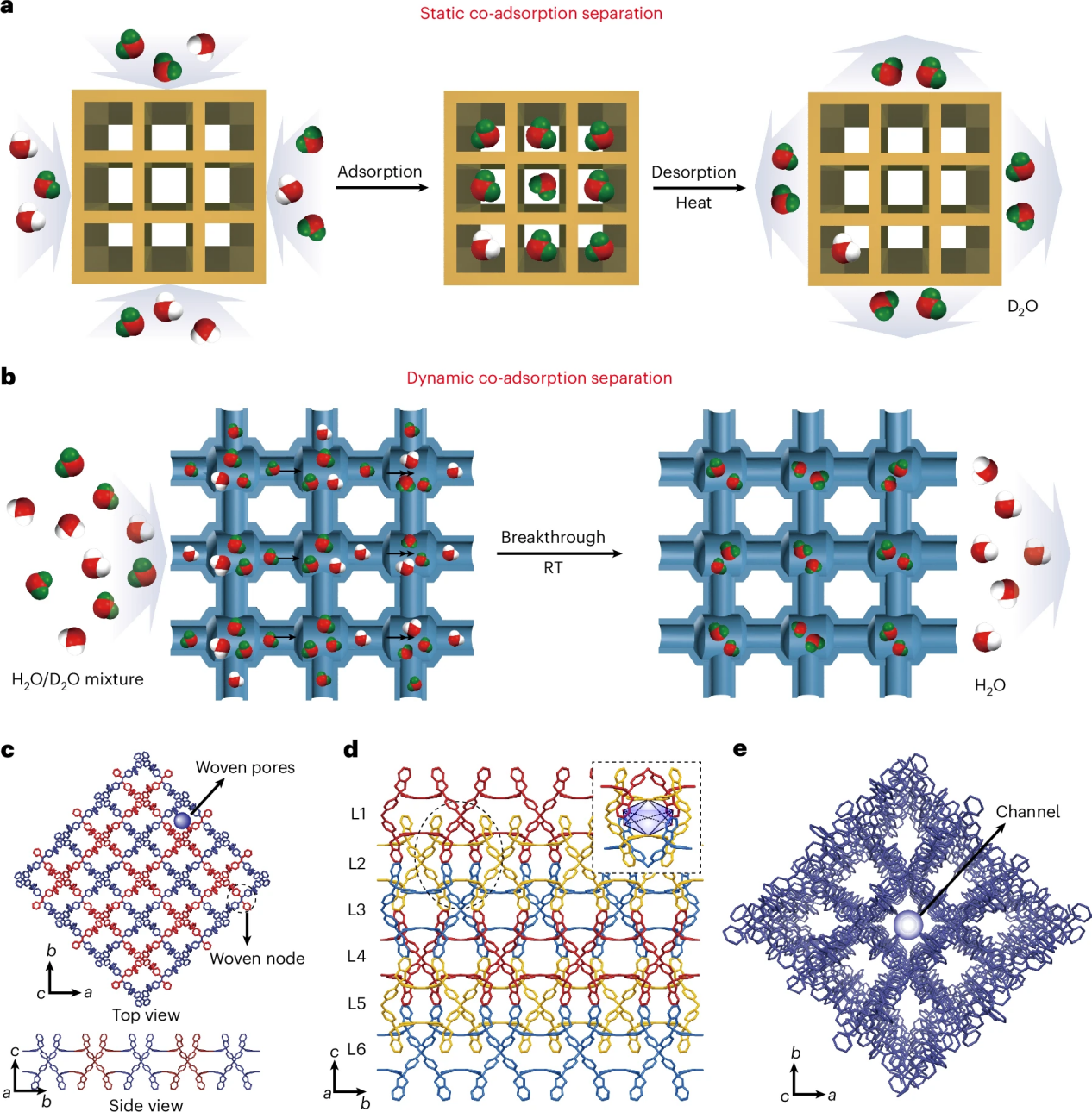 重水(D2O)是核能、医疗等领域的关键战略资源,但其自然丰度极低,仅约为0.015%。由于H2O与D2O在尺寸和化学性质上高度相似,传统分离方法如蒸馏、电解等存在能耗高、效率低的问题,因此开发高效、节能的水同位素体分离技术一直是科研界面临的重大挑战。