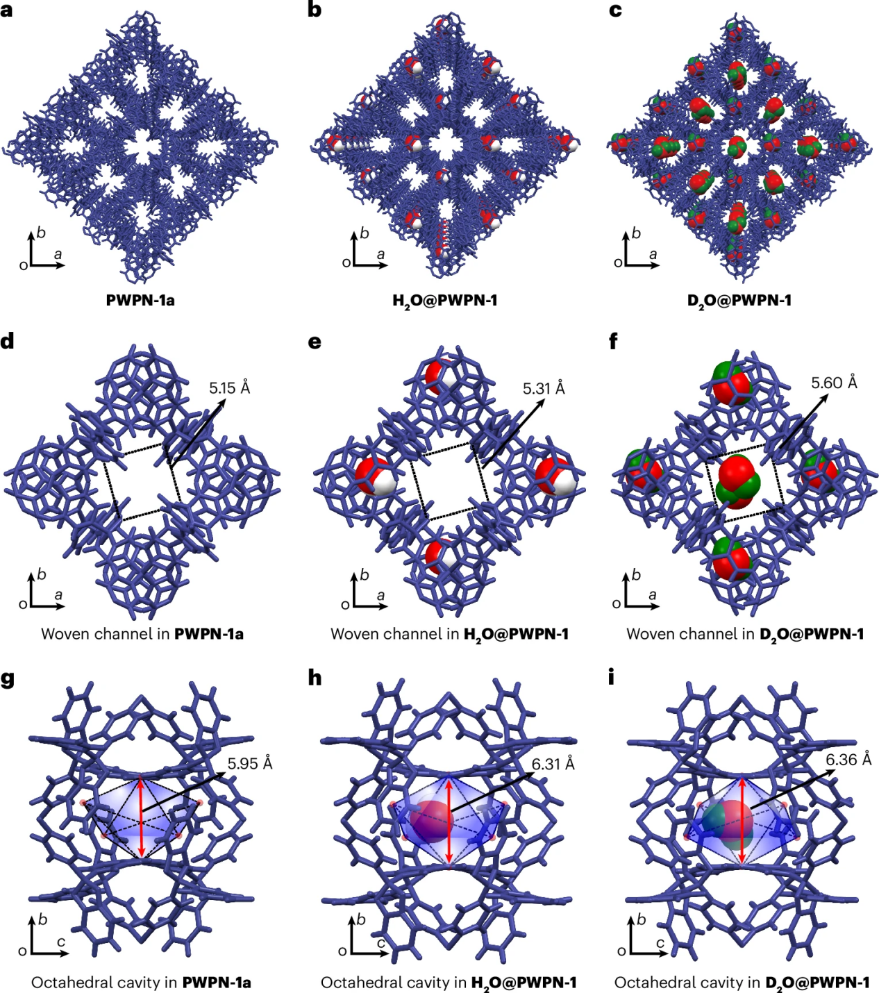 吸附H2O和D2O后获得的单晶结构,为揭示其分离机制提供了直接证据。结构分析表明,材料的编织通道在吸附后发生了差异化的自适应扩张:吸附H2O时,通道边长从5.15 Å扩展至5.31 Å(图3d,e);而在吸附D2O时,则进一步扩张至5.60 Å(图3f)。同时,八面体空腔也出现相应膨胀(图3g-i)。这一系列精确的结构响应,表明材料能够通过其结构柔性精准识别D2O分子并实现优先锚定。