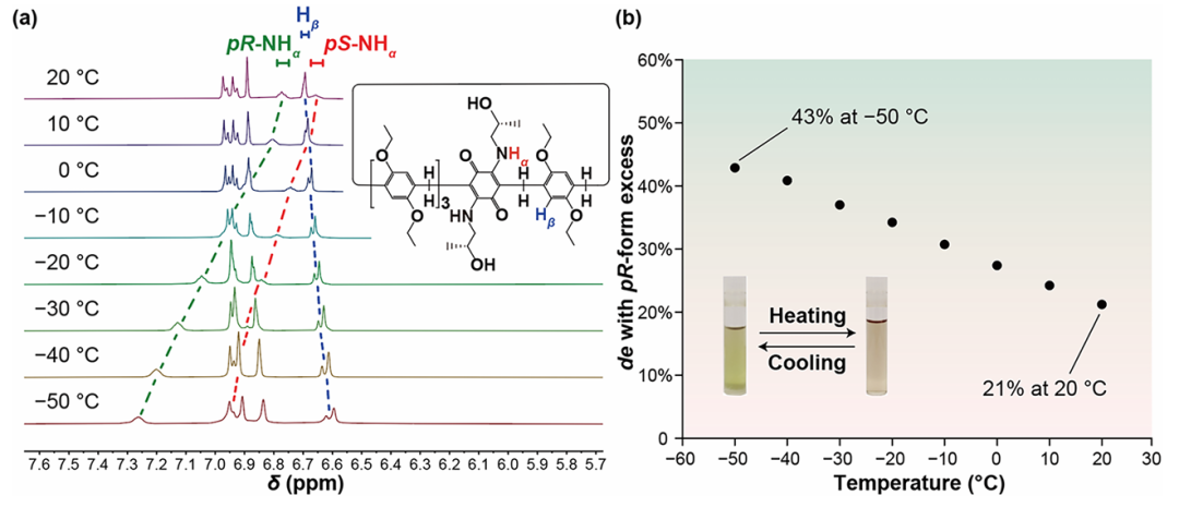 图4.(a)P5N-R的变温核磁共振氢谱,其中pR型氨基质子的化学位移变化用绿色表示,pS型氨基质子的化学位移变化用红色表示。(b)P5N-R在氘代二氯甲烷中非对映异构体过量值(de)随温度变化的图,并且溶液颜色随温度变化而改变。