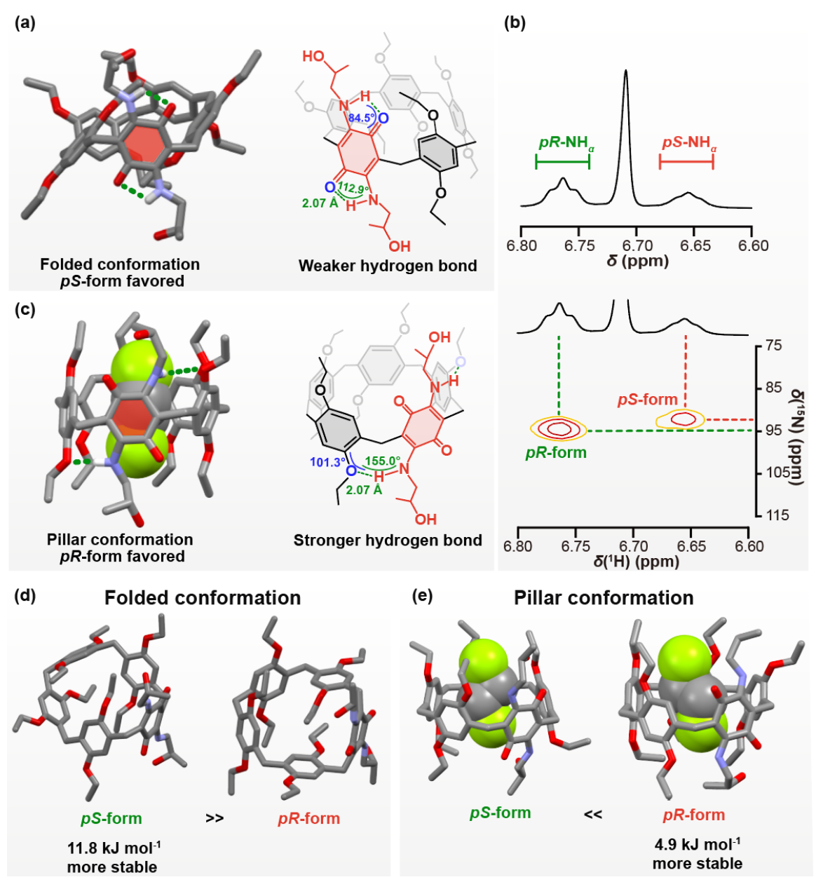 通过单晶衍射和核磁共振波谱分析,并结合密度泛函理论计算,我们发现在溶液中,P5N-R在有客体和无客体的情况下分别存在两种构象。有客体时,柱状构象占据主导,此时pR构型较为有利,同时由于强氢键的影响,氨基对苯醌单元的给电子能力被削弱,颜色发生了红移。而在无客体时,折叠构象占据主导,此时pS构型较为有利,同时由于氢键较弱,呈现出粉红色(图2)。