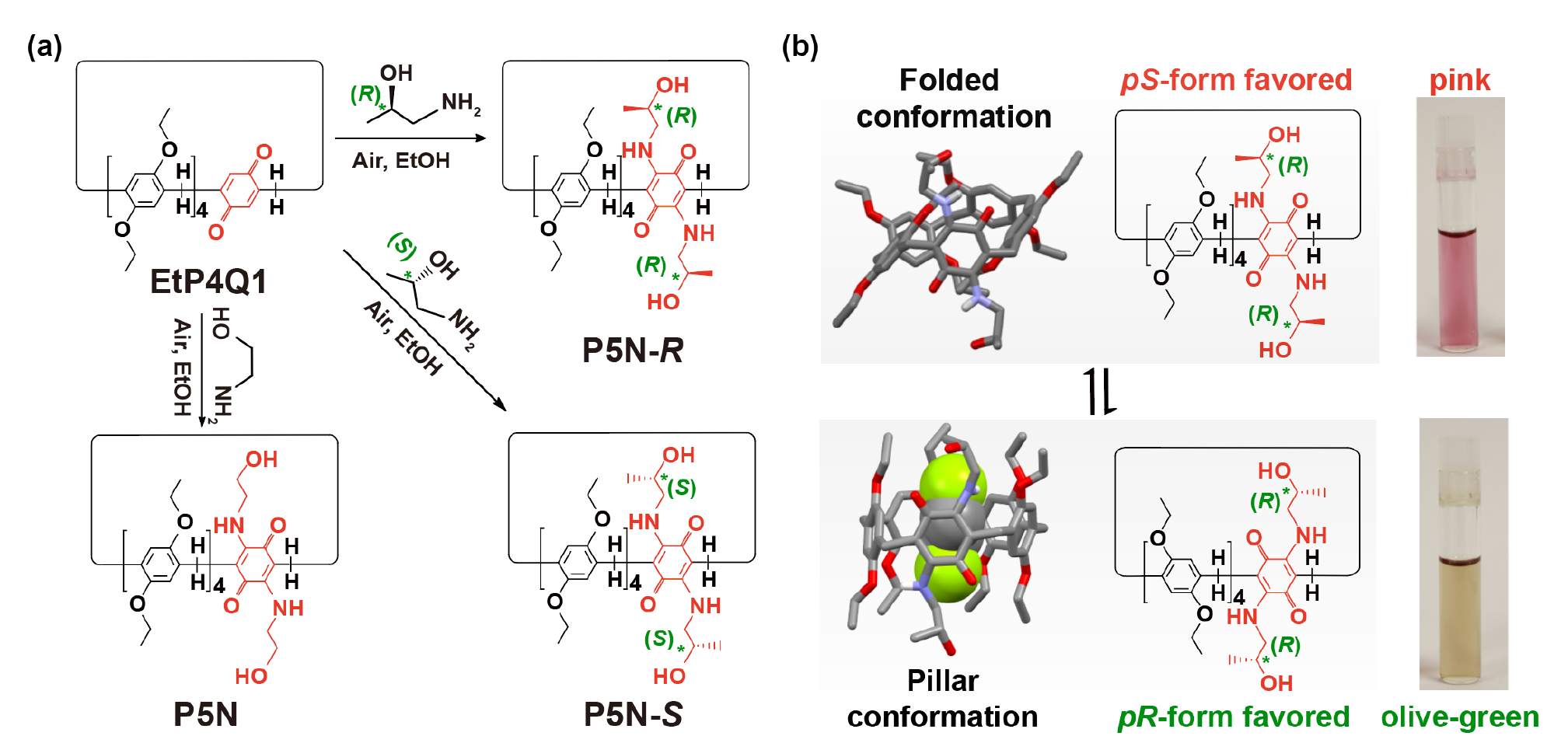 首先,研究者利用硝酸铈铵选择性氧化全乙基柱[5]芳烃得到EtP4Q1,并通过Michael加成反应引入带有羟基的手性胺单元,得到P5N-R和P5N-S,通过质谱和核磁共振波谱等分析手段对其结构进行了表征和确认。此类具有羟基作为助色团的氨基苯醌对外界化学环境非常敏感,微小的化学环境变化即可带来肉眼可见的颜色变化。