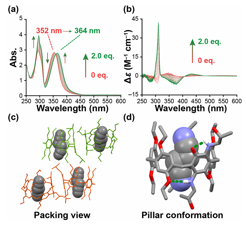 图3.(a)向P5N-R的氯代环己烷溶液中滴加丁二腈时的紫外可见光谱。(b)向P5N-R的氯代环己烷溶液中滴加丁二腈时的圆二色光谱。(c)P5N-R与丁二腈形成包合物的晶体结构堆积图,其中pR构型用绿色表示,pS构型用红色表示。(d)晶体结构中pR构型的详细结构。