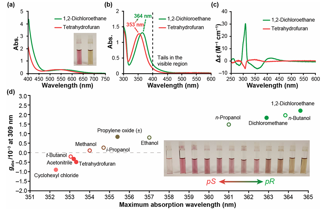 图1.(a)P5N-R在1,2-二氯乙烷和四氢呋喃中的紫外可见光谱。插图照片显示了P5N-R在四氢呋喃(左侧样品瓶)和1,2-二氯乙烷(右侧样品瓶)中呈现的不同颜色。(b)P5N-R在1,2-二氯乙烷和四氢呋喃中的紫外可见光谱。(c)P5N-R在1,2-二氯乙烷和四氢呋喃中的圆二色光谱。(d)P5N-R在不同溶剂中的吸光度各向异性因子(gabs)值与最大吸收波长的关系图。在P5N-R溶液的插图照片中,从左到右样品瓶中的溶剂按gabs值递增顺序排列。