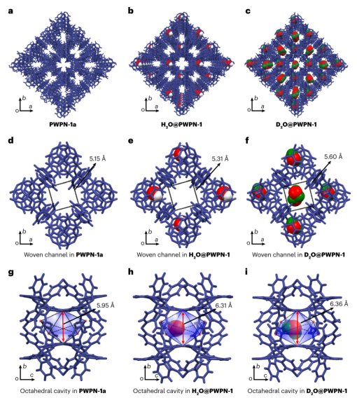 通过高分辨率的晶体结构分析,科学家们直接“看到”了微观世界里发生的奇迹:在空置状态下,编织通道的边长为 5.15 埃。当H₂O分子进入后,通道会微微膨胀至 5.31 埃,以容纳H₂O分子。而当更“胖”一点的D₂O分子到来时,通道竟然会扩张得更大,达到5.60 埃!