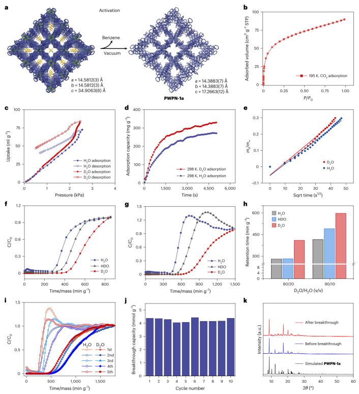 图1:水同位素体分离策略的概念总结与编织聚合物单晶PWPN-1的晶体结构。